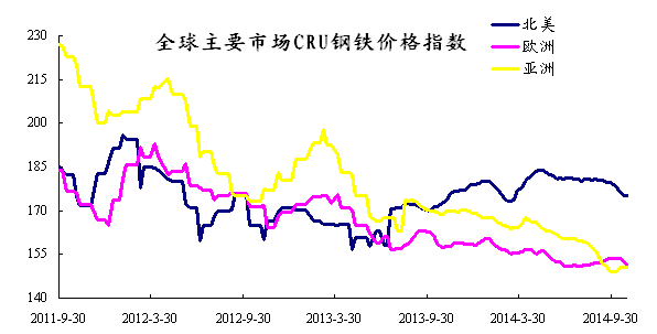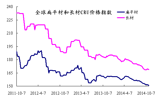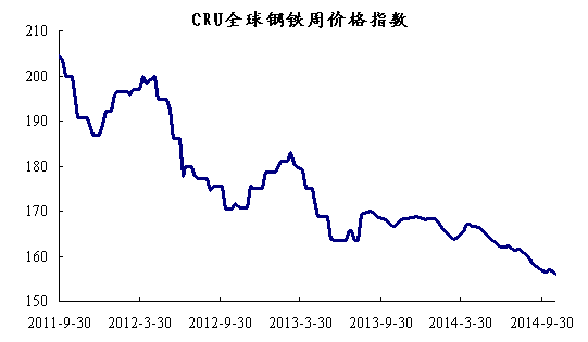 上周國際鋼市整體繼續走低,CRU國際鋼價綜合指數為156.13,CRU扁平材指數為150.62,CRU長材指數為168.88,北美市場CRU價格指數為175.15,歐洲市場CRU價格指數為151.24,亞洲市場CRU價格指數為150.47。