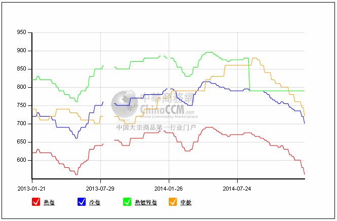 2014年美國薄板市場的走勢可以用先揚后抑來形容。上半年板材價格低位回升的走勢得益于美國鋼廠連續(xù)提價,增強了商家信心。同時,市場需求尚可,且?guī)齑鎵毫Σ淮蟆_@些利好因素成就了美國薄板價格的上漲。但是下半年以來,薄板價格高位回落。特別是受美元強勁走勢,以及大宗商品價格不斷跳水影響,美國薄板價格開始下跌。另外,隨著訂單減少,庫存不斷攀升,以及低價進口資源的多重壓力,美國薄板價格開啟了小幅下滑之路。