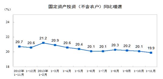 2013年1-10月份,全國固定資產投資351669億元,同比名義增長20.1%,增速比1-9月份回落0.1個百分點。但10月固定資產投資增長仍低于前9個月平均近一個百分點%。1-11月份,全國固定資產投資(不含農戶)391283億元,同比名義增長19.9%,增速比1-10月份回落0.2個百分點。其中11月份與前10月平均下降2個百分點。下降幅度呈現增加的趨勢。
