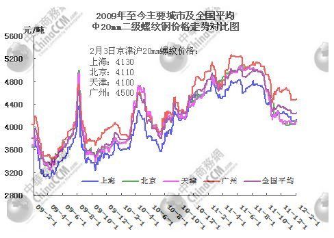 實際上,即使進入2月份,經濟運行總體趨勢仍是增速緩緩回落。影響鋼材市場需求進一步減少。這就使得進入今年2月份,鋼材市場在需求疲軟,庫存增加1700萬噸的嚴峻形勢下,價格面臨很大的回落壓力。實際上今年1月5日上海市場大螺紋鋼價格4160元,日前已經跌破4000元 顯示出建筑市場投資的回落趨勢的嚴峻性。 8mm熱卷一直保持在4230,春節過后,貿易商曾試圖拉漲市場價格,但目前僅僅4250元一噸。市場需求疲軟仍制約鋼材價格走勢。