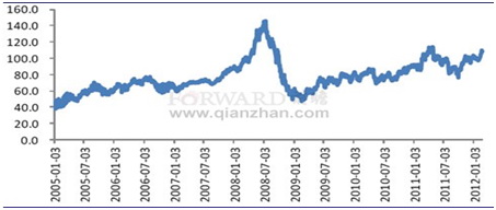 下面是2005年1月-2012年2月紐約輕質原油期貨價格走勢(美元/桶)